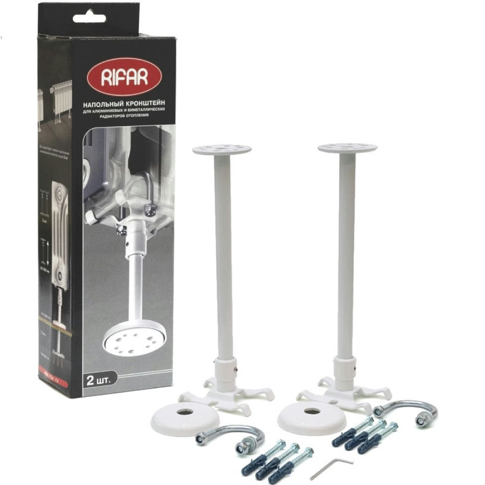 Напольные кронштейны применяют для установки радиаторов в местах где крепление к стене невозможно. Напольный кронштейн RIFAR может быть установлен как на черновой, так и на чистовой пол. В случае необходимости уменьшения высоты кронштейна следует отрезать стойку согласно инструкции. Минимальное количество секций радиатора – 4 шт.