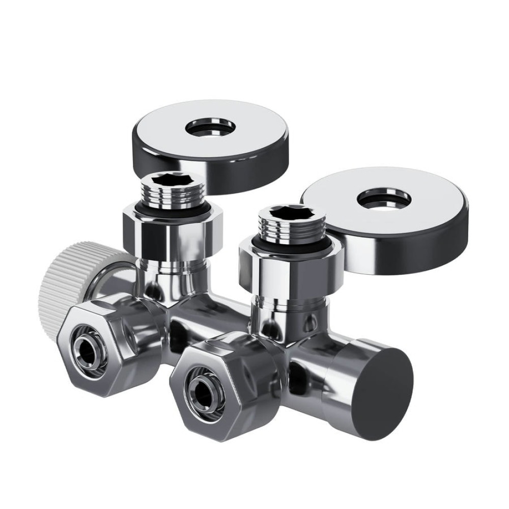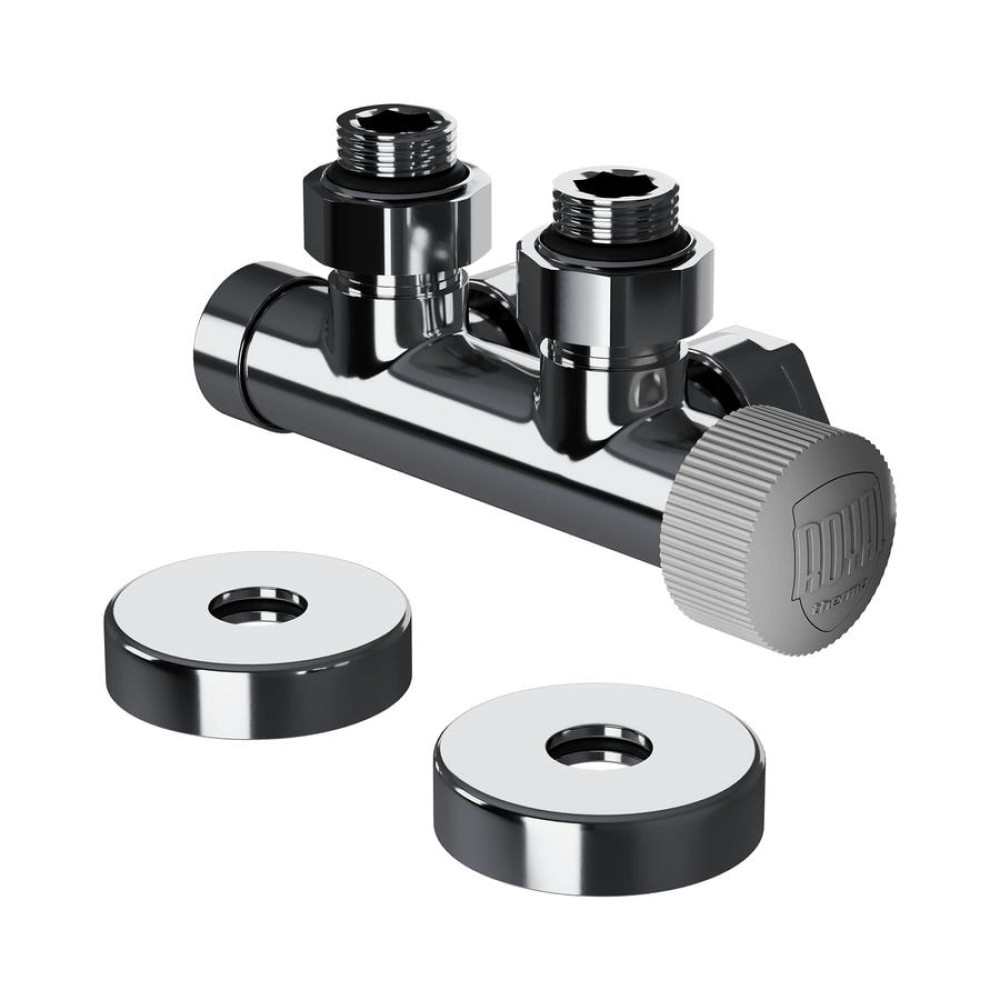Узел нижнего подключения термостатический угловой серии Design Pro поставляется в необходимой для чистового монтажа комплектации: клапан термостатический для установки на подающий трубопровод, запорный клапан для установки на обратный трубопровод, 2 гайки-фитинга для подключения клапанов к монтажной трубке 15 мм и 2 цельных латунных отражателя с внутренним резиновым уплотнением внутренним диаметром 15,2 мм.