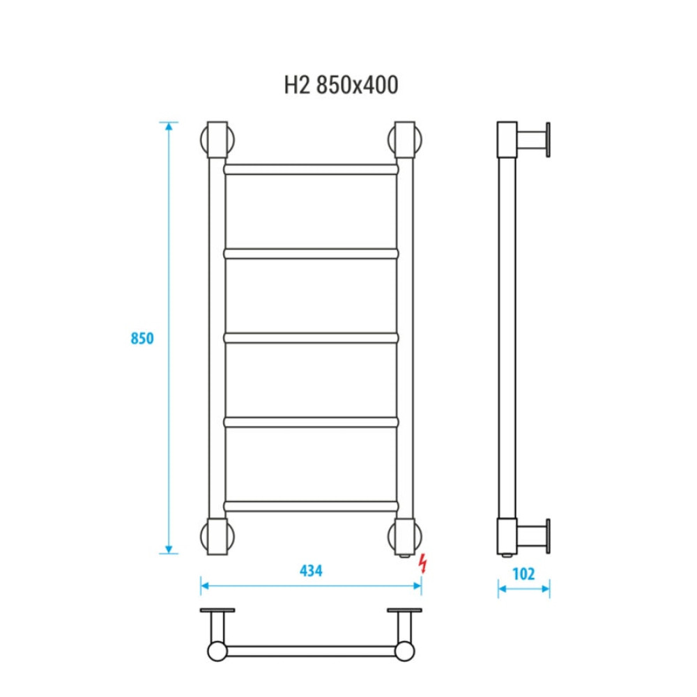 Energy H2 850x400 - электрический полотенцесушитель - лесенка с пятью прямыми стационарными перекладинами, равномерно разнесенными по высоте изделия. Выполнен из высококачественной пищевой нержавеющей стали.