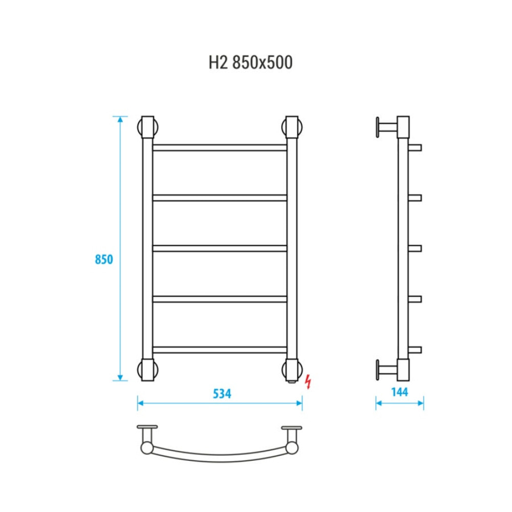Energy H2 850x500 - электрический полотенцесушитель - лесенка с пятью выпуклыми стационарными перекладинами, равномерно разнесенными по высоте изделия. Выполнен из высококачественной пищевой нержавеющей стали.