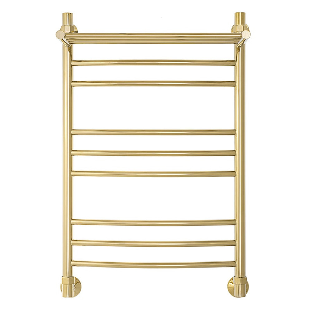 Водяной полотенцесушитель Energy Prestige Modus 800x500 (Золотой цвет) - «лесенка c полкой» c выпуклыми перемычками, размещёнными группами. Дополнительная обогреваемая полка с 3 перекладинами увеличивает тепловую мощность и полезную площадь прибора, а также позволяет максимально удобно располагать на нем вещи для просушивания. Используется во всех системах горячего водоснабжения и отопления с рабочим давлением 3 - 15 атм при температуре теплоносителя до 105°С.