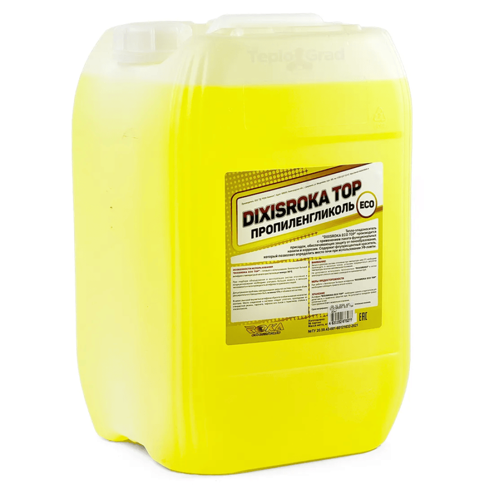 Теплоноситель DIXIS ROKA TOP (Eco) 20 кг представляет собой безопасный антифриз, который используется как рабочая жидкость в теплообменном оборудовании фармацевтической, пищевой, парфюмерной и ряда других промышленных отраслей. Также Dixis TOP применяется в отопительных системах и системах кондиционирования как жилых сооружений, так и промышленных предприятий. Использование этого антифриза исключает «размораживание» систем отопления при отрицательных температурах, а также защищает оборудование от образования накипи, развития микроорганизмов и возникновения коррозии.