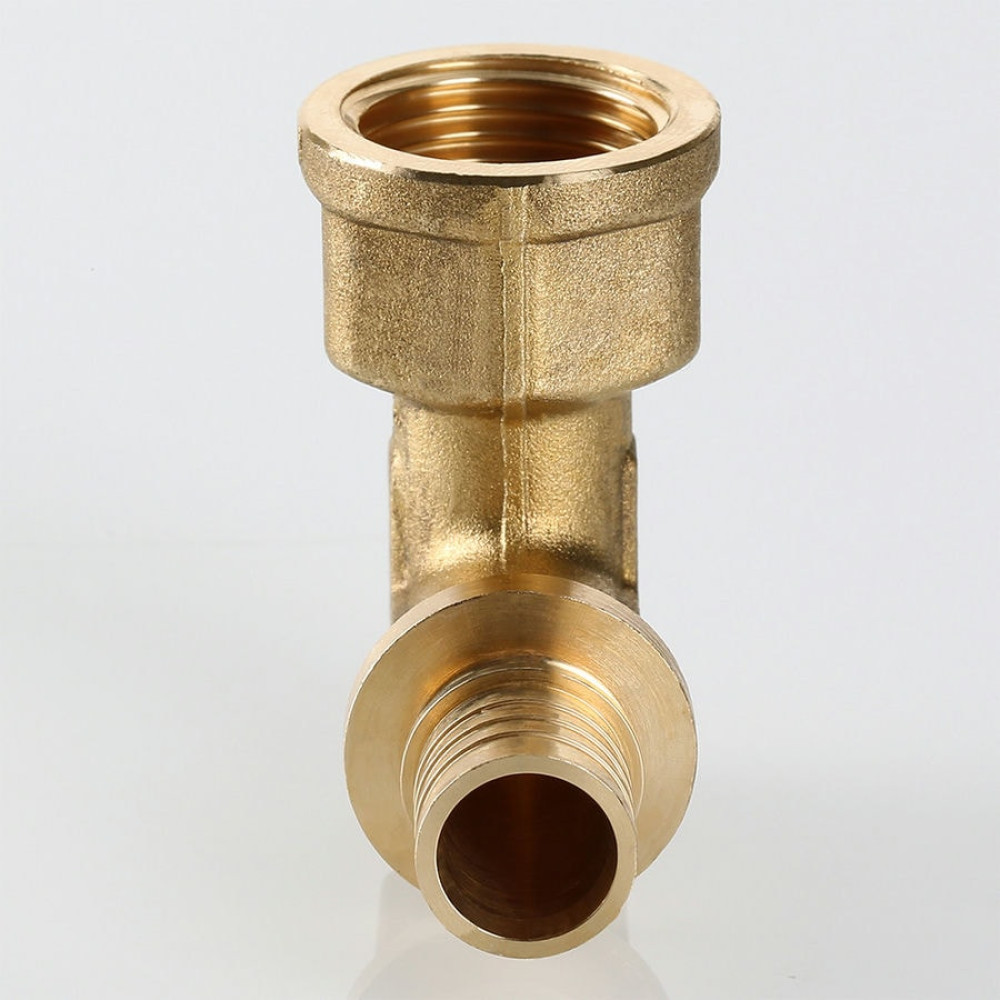 Угольник надвижной VTm.452.BG – латунный универсальный аксиальный фитинг для соединения под углом 90° трубы из PEX или PE-RT с резьбовым элементом трубопровода (резьба фитинга – внутренняя).