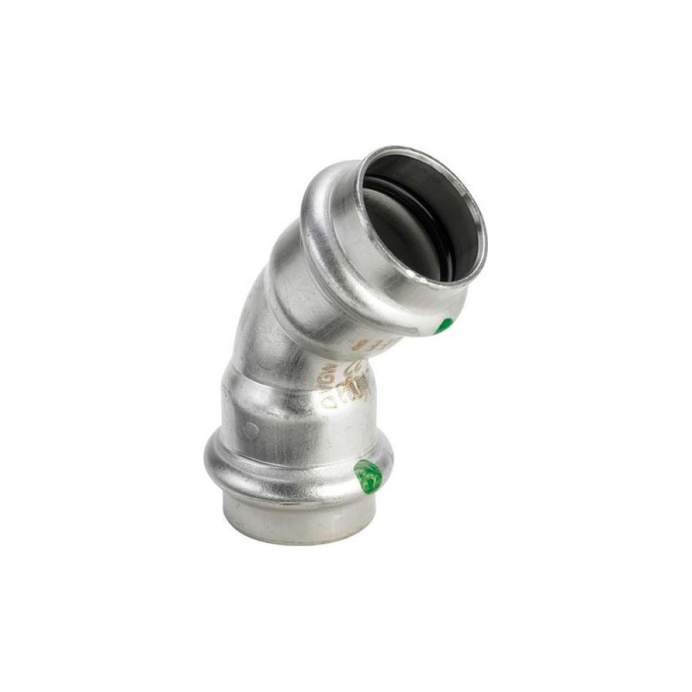 Пресс-отвод из нержавеющей стали Viega Sanpress Inox 15 мм. В-В 45° с SC-Contur (серия 2326) арт. 435776 позволяет выполнить поворот трубопровода из нержавеющей стали диаметром 15 мм под углом 45°. Отвод имеет два раструба под опрессовку. Фитинг дополнен кольцевыми уплотнениями О-Ring из EPDM, которые обеспечивают герметичность соединения.
