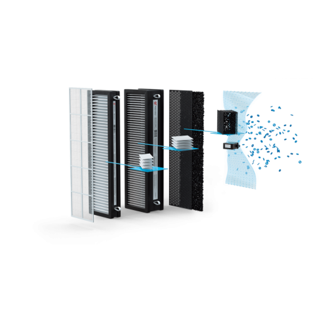 Эффективная очистка воздуха обеспечивается 5-ступенчатой системой фильтрации, которая препятствует проникновению в помещение неприятного запаха и задерживает мельчайшие частицы пыли и аллергенов, очищая воздух до 99,5%.