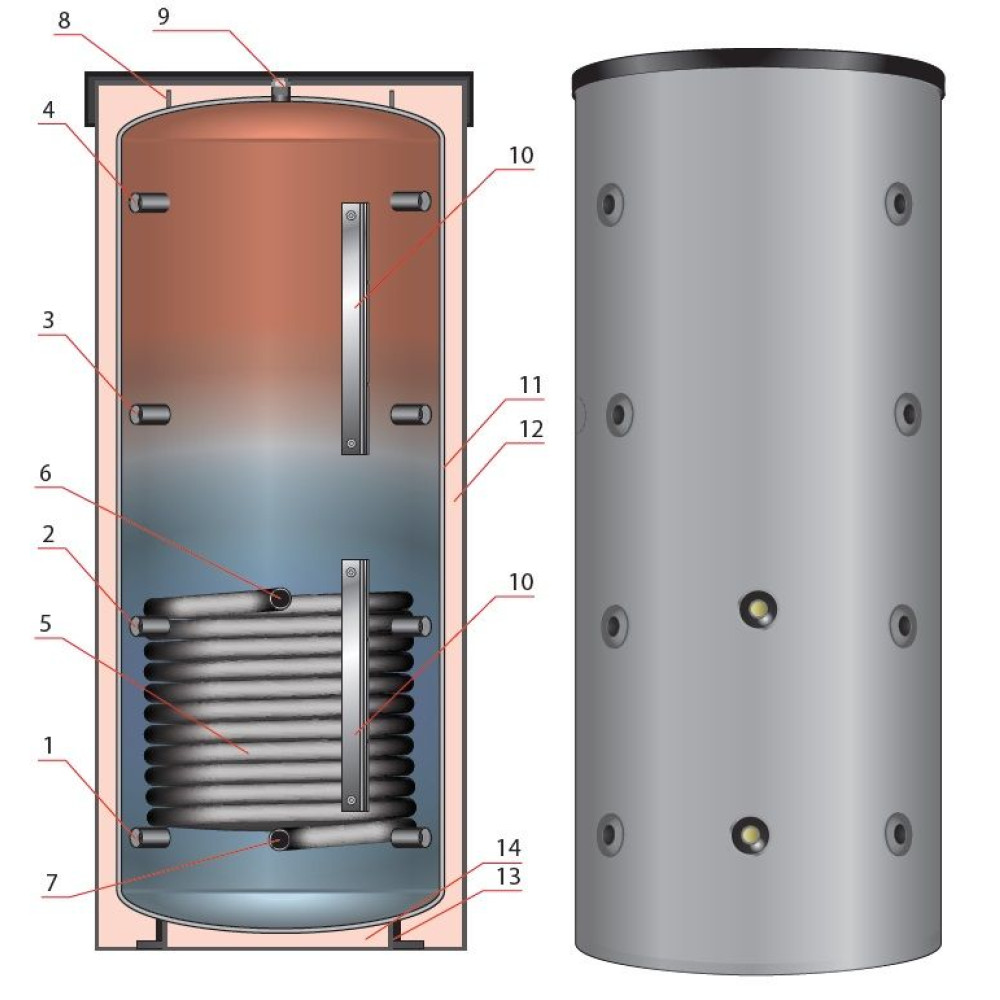Буферный накопитель Kospel SVW предназначен для напольной, вертикальной установки и прекрасно подойдет для обслуживания частного дома или дачи. Оборудование имеет стильный внешний вид и оснащено большим количеством патрубков для подключения воды, змеевика, датчика температуры, воздухоотводчика. Производится устройство в Польше. В данной линейке представлено оборудование объемом от 200 до 1000 литров, оснащенное встроенным змеевиком. Накопители отличаются надежностью и высоким качеством сборки.
