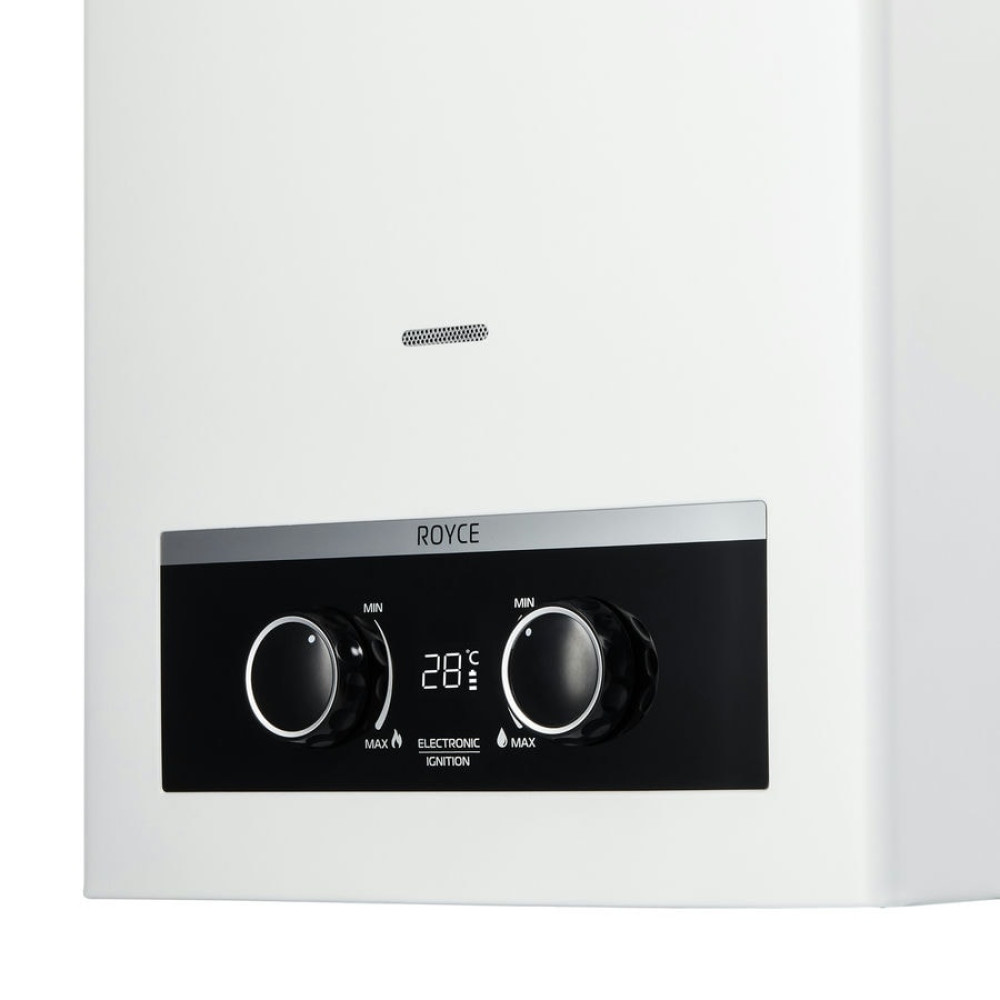 Флагманская серия газовых водонагревателей Royce, в конструкцию которых положены самые передовые технологии, обладает высокой производительностью и долговечностью. Приборы оснащены удобным и безопасным электронным розжигом, а также информативным современным цифровым дисплеем, который отображает температуру нагрева воды, заряд батареи и индикацию пламени на горелке.