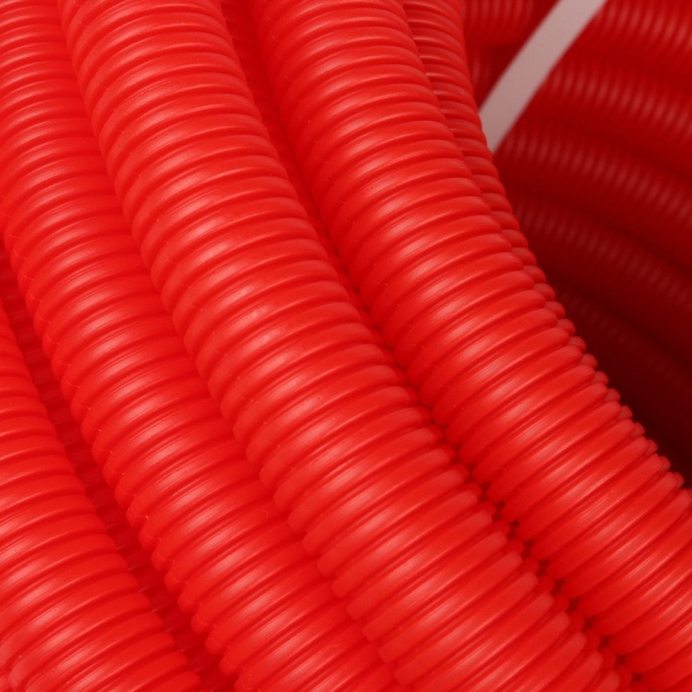 Гофрированная труба Stout 25 мм красная (для труб 20 мм) в бухтах 50 метров - 1 м предназначена для протяжки газовых труб и труб водоснабжения через строительные конструкции (стены, перегородки, перекрытия). Также защитные трубы подходят для прокладки под заливку бетоном и для монтажа в цементной стяжке. Не допускается использование труб в качестве газовых или напорных труб водоснабжения и водоотведения.