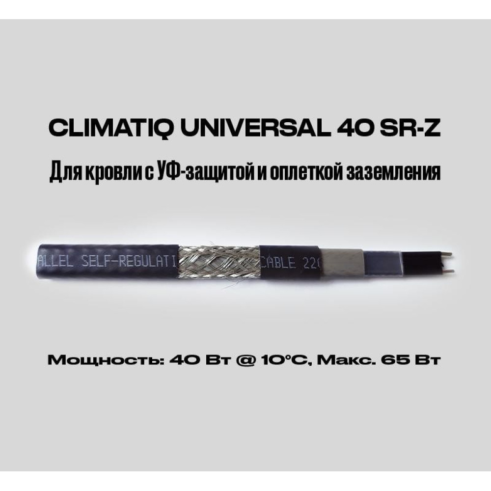 Саморегулирующиеся кабели CLIMATIQ U 40 SR-Z, предназначены для борьбы и предупреждения образования наледи и сосулек в сегменте кровель (водосточные системы, карнизные свесы, водоприемные устройства, ендовы, кромки кровель, периметр рам и нижняя часть мансардных окон и пр.). Также кабели могут быть установлены на поверхность трубопроводов для защиты от замерзания.