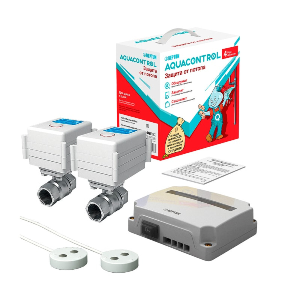 Система контроля протечки воды Neptun Aquacontrol 1/2" предназначена для своевременного обнаружения и локализации протечек воды в системе водоснабжения и отопления жилых домов, коттеджей, офисных зданий, магазинов. Система заблокирует подачу воды до устранения причин протечки и проинформирует о возникшей аварии звуковым и световым сигналами. Система защиты от протечек AquaControl 1/2" – это готовый комплект, который легко установить в любом помещении независимо от ремонта.
